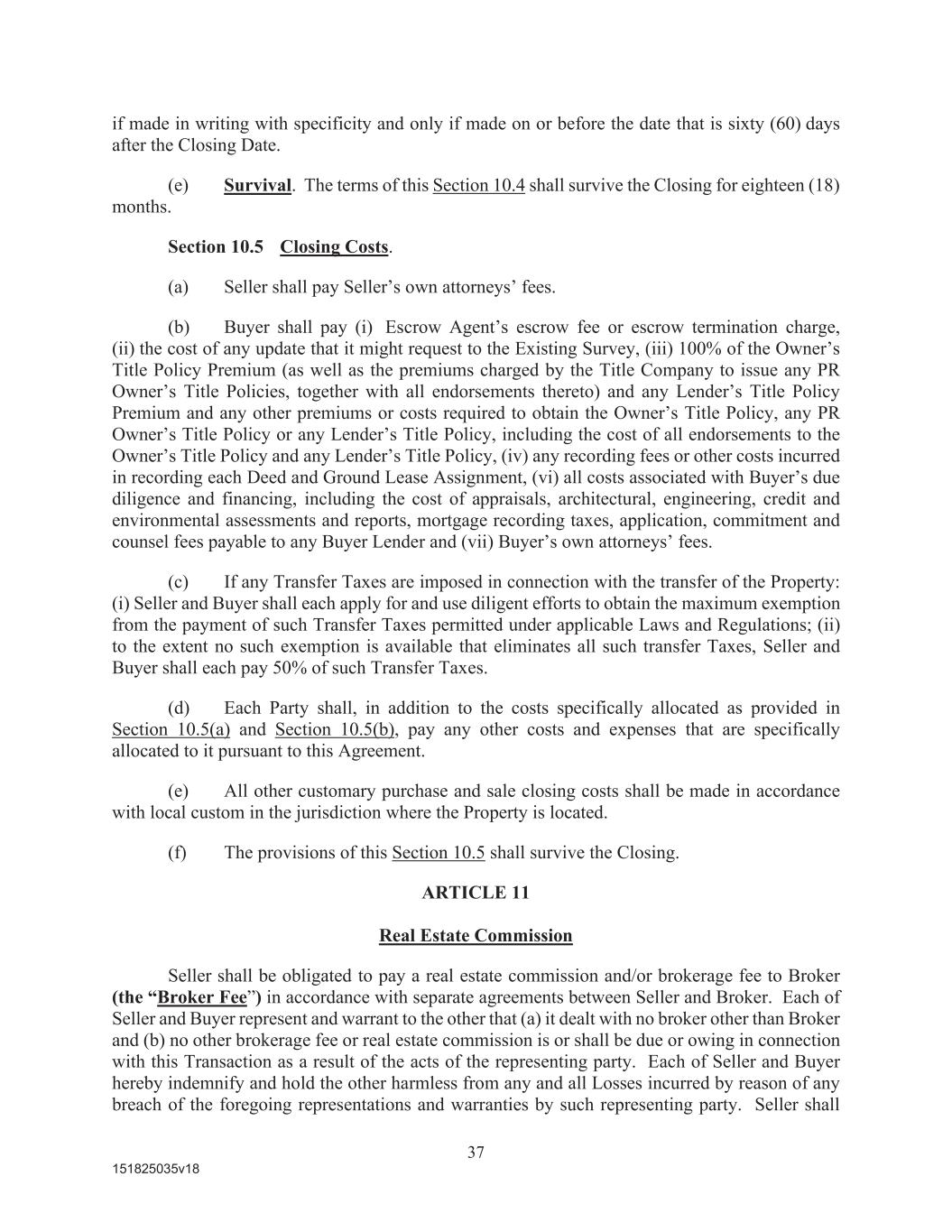 37 151825035v18 if made in writing with specificity and only if made on or before the date that is sixty (60) days after the Closing Date. (e) Survival. The terms of this Section 10.4 shall survive the Closing for eighteen (18) months. Section 10.5 Closing Costs. (a) Seller shall pay Seller’s own attorneys’ fees. (b) Buyer shall pay (i) Escrow Agent’s escrow fee or escrow termination charge, (ii) the cost of any update that it might request to the Existing Survey, (iii) 100% of the Owner’s Title Policy Premium (as well as the premiums charged by the Title Company to issue any PR Owner’s Title Policies, together with all endorsements thereto) and any Lender’s Title Policy Premium and any other premiums or costs required to obtain the Owner’s Title Policy, any PR Owner’s Title Policy or any Lender’s Title Policy, including the cost of all endorsements to the Owner’s Title Policy and any Lender’s Title Policy, (iv) any recording fees or other costs incurred in recording each Deed and Ground Lease Assignment, (vi) all costs associated with Buyer’s due diligence and financing, including the cost of appraisals, architectural, engineering, credit and environmental assessments and reports, mortgage recording taxes, application, commitment and counsel fees payable to any Buyer Lender and (vii) Buyer’s own attorneys’ fees. (c) If any Transfer Taxes are imposed in connection with the transfer of the Property: (i) Seller and Buyer shall each apply for and use diligent efforts to obtain the maximum exemption from the payment of such Transfer Taxes permitted under applicable Laws and Regulations; (ii) to the extent no such exemption is available that eliminates all such transfer Taxes, Seller and Buyer shall each pay 50% of such Transfer Taxes. (d) Each Party shall, in addition to the costs specifically allocated as provided in Section 10.5(a) and Section 10.5(b), pay any other costs and expenses that are specifically allocated to it pursuant to this Agreement. (e) All other customary purchase and sale closing costs shall be made in accordance with local custom in the jurisdiction where the Property is located. (f) The provisions of this Section 10.5 shall survive the Closing. ARTICLE 11 Real Estate Commission Seller shall be obligated to pay a real estate commission and/or brokerage fee to Broker (the “Broker Fee”) in accordance with separate agreements between Seller and Broker. Each of Seller and Buyer represent and warrant to the other that (a) it dealt with no broker other than Broker and (b) no other brokerage fee or real estate commission is or shall be due or owing in connection with this Transaction as a result of the acts of the representing party. Each of Seller and Buyer hereby indemnify and hold the other harmless from any and all Losses incurred by reason of any breach of the foregoing representations and warranties by such representing party. Seller shall