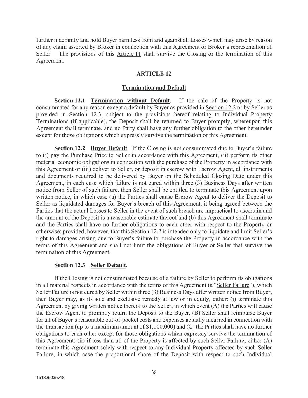 38 151825035v18 further indemnify and hold Buyer harmless from and against all Losses which may arise by reason of any claim asserted by Broker in connection with this Agreement or Broker’s representation of Seller. The provisions of this Article 11 shall survive the Closing or the termination of this Agreement. ARTICLE 12 Termination and Default Section 12.1 Termination without Default. If the sale of the Property is not consummated for any reason except a default by Buyer as provided in Section 12.2 or by Seller as provided in Section 12.3, subject to the provisions hereof relating to Individual Property Terminations (if applicable), the Deposit shall be returned to Buyer promptly, whereupon this Agreement shall terminate, and no Party shall have any further obligation to the other hereunder except for those obligations which expressly survive the termination of this Agreement. Section 12.2 Buyer Default. If the Closing is not consummated due to Buyer’s failure to (i) pay the Purchase Price to Seller in accordance with this Agreement, (ii) perform its other material economic obligations in connection with the purchase of the Property in accordance with this Agreement or (iii) deliver to Seller, or deposit in escrow with Escrow Agent, all instruments and documents required to be delivered by Buyer on the Scheduled Closing Date under this Agreement, in each case which failure is not cured within three (3) Business Days after written notice from Seller of such failure, then Seller shall be entitled to terminate this Agreement upon written notice, in which case (a) the Parties shall cause Escrow Agent to deliver the Deposit to Seller as liquidated damages for Buyer’s breach of this Agreement, it being agreed between the Parties that the actual Losses to Seller in the event of such breach are impractical to ascertain and the amount of the Deposit is a reasonable estimate thereof and (b) this Agreement shall terminate and the Parties shall have no further obligations to each other with respect to the Property or otherwise; provided, however, that this Section 12.2 is intended only to liquidate and limit Seller’s right to damages arising due to Buyer’s failure to purchase the Property in accordance with the terms of this Agreement and shall not limit the obligations of Buyer or Seller that survive the termination of this Agreement. Section 12.3 Seller Default. If the Closing is not consummated because of a failure by Seller to perform its obligations in all material respects in accordance with the terms of this Agreement (a “Seller Failure”), which Seller Failure is not cured by Seller within three (3) Business Days after written notice from Buyer, then Buyer may, as its sole and exclusive remedy at law or in equity, either: (i) terminate this Agreement by giving written notice thereof to the Seller, in which event (A) the Parties will cause the Escrow Agent to promptly return the Deposit to the Buyer, (B) Seller shall reimburse Buyer for all of Buyer’s reasonable out-of-pocket costs and expenses actually incurred in connection with the Transaction (up to a maximum amount of $1,000,000) and (C) the Parties shall have no further obligations to each other except for those obligations which expressly survive the termination of this Agreement; (ii) if less than all of the Property is affected by such Seller Failure, either (A) terminate this Agreement solely with respect to any Individual Property affected by such Seller Failure, in which case the proportional share of the Deposit with respect to such Individual