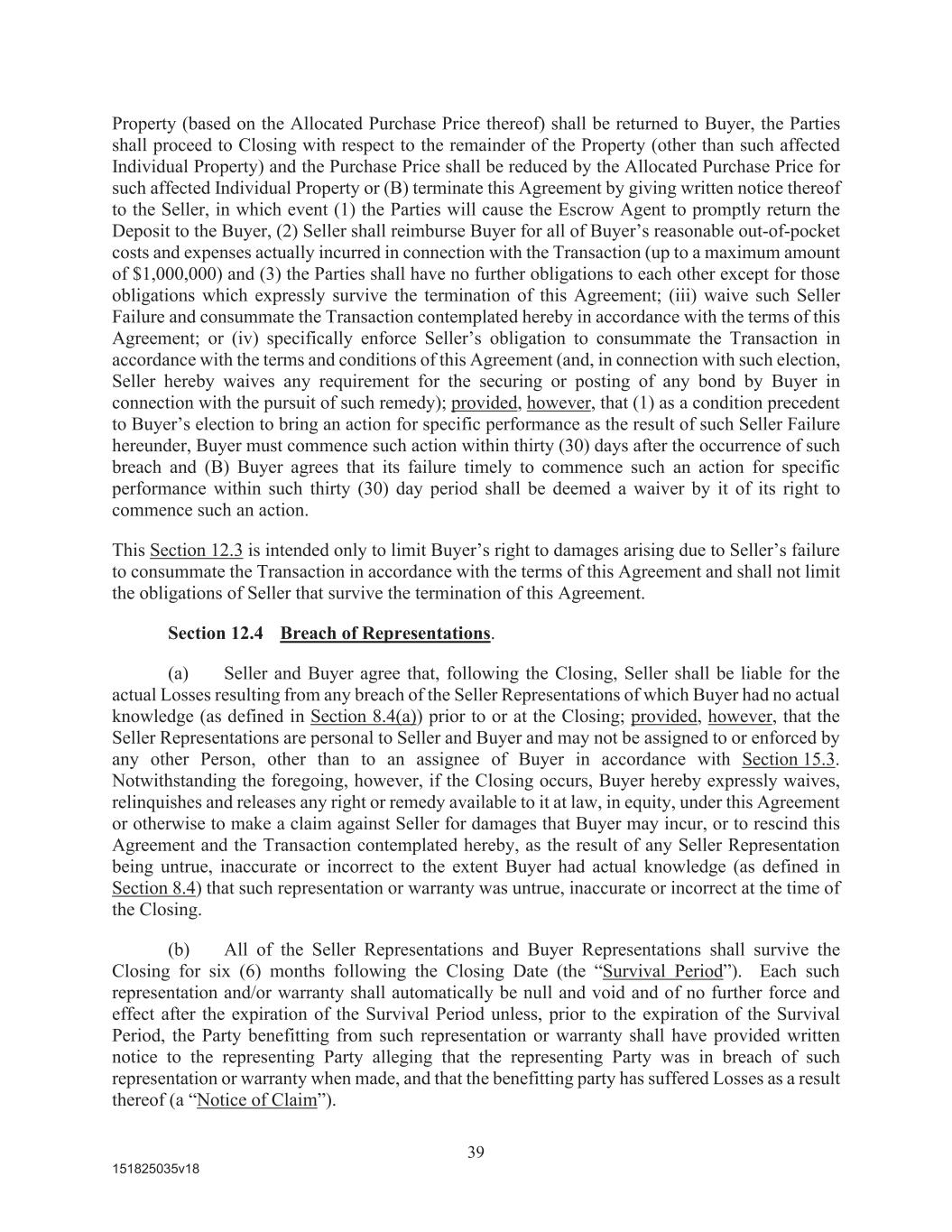 39 151825035v18 Property (based on the Allocated Purchase Price thereof) shall be returned to Buyer, the Parties shall proceed to Closing with respect to the remainder of the Property (other than such affected Individual Property) and the Purchase Price shall be reduced by the Allocated Purchase Price for such affected Individual Property or (B) terminate this Agreement by giving written notice thereof to the Seller, in which event (1) the Parties will cause the Escrow Agent to promptly return the Deposit to the Buyer, (2) Seller shall reimburse Buyer for all of Buyer’s reasonable out-of-pocket costs and expenses actually incurred in connection with the Transaction (up to a maximum amount of $1,000,000) and (3) the Parties shall have no further obligations to each other except for those obligations which expressly survive the termination of this Agreement; (iii) waive such Seller Failure and consummate the Transaction contemplated hereby in accordance with the terms of this Agreement; or (iv) specifically enforce Seller’s obligation to consummate the Transaction in accordance with the terms and conditions of this Agreement (and, in connection with such election, Seller hereby waives any requirement for the securing or posting of any bond by Buyer in connection with the pursuit of such remedy); provided, however, that (1) as a condition precedent to Buyer’s election to bring an action for specific performance as the result of such Seller Failure hereunder, Buyer must commence such action within thirty (30) days after the occurrence of such breach and (B) Buyer agrees that its failure timely to commence such an action for specific performance within such thirty (30) day period shall be deemed a waiver by it of its right to commence such an action. This Section 12.3 is intended only to limit Buyer’s right to damages arising due to Seller’s failure to consummate the Transaction in accordance with the terms of this Agreement and shall not limit the obligations of Seller that survive the termination of this Agreement. Section 12.4 Breach of Representations. (a) Seller and Buyer agree that, following the Closing, Seller shall be liable for the actual Losses resulting from any breach of the Seller Representations of which Buyer had no actual knowledge (as defined in Section 8.4(a)) prior to or at the Closing; provided, however, that the Seller Representations are personal to Seller and Buyer and may not be assigned to or enforced by any other Person, other than to an assignee of Buyer in accordance with Section 15.3. Notwithstanding the foregoing, however, if the Closing occurs, Buyer hereby expressly waives, relinquishes and releases any right or remedy available to it at law, in equity, under this Agreement or otherwise to make a claim against Seller for damages that Buyer may incur, or to rescind this Agreement and the Transaction contemplated hereby, as the result of any Seller Representation being untrue, inaccurate or incorrect to the extent Buyer had actual knowledge (as defined in Section 8.4) that such representation or warranty was untrue, inaccurate or incorrect at the time of the Closing. (b) All of the Seller Representations and Buyer Representations shall survive the Closing for six (6) months following the Closing Date (the “Survival Period”). Each such representation and/or warranty shall automatically be null and void and of no further force and effect after the expiration of the Survival Period unless, prior to the expiration of the Survival Period, the Party benefitting from such representation or warranty shall have provided written notice to the representing Party alleging that the representing Party was in breach of such representation or warranty when made, and that the benefitting party has suffered Losses as a result thereof (a “Notice of Claim”).
