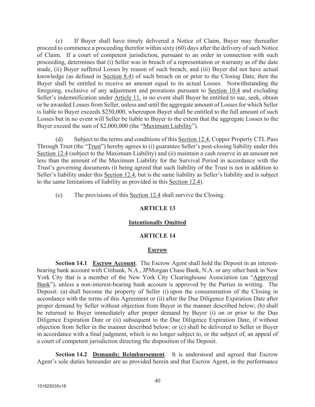 40 151825035v18 (c) If Buyer shall have timely delivered a Notice of Claim, Buyer may thereafter proceed to commence a proceeding therefor within sixty (60) days after the delivery of such Notice of Claim. If a court of competent jurisdiction, pursuant to an order in connection with such proceeding, determines that (i) Seller was in breach of a representation or warranty as of the date made, (ii) Buyer suffered Losses by reason of such breach, and (iii) Buyer did not have actual knowledge (as defined in Section 8.4) of such breach on or prior to the Closing Date, then the Buyer shall be entitled to receive an amount equal to its actual Losses. Notwithstanding the foregoing, exclusive of any adjustment and prorations pursuant to Section 10.4 and excluding Seller’s indemnification under Article 11, in no event shall Buyer be entitled to sue, seek, obtain or be awarded Losses from Seller, unless and until the aggregate amount of Losses for which Seller is liable to Buyer exceeds $250,000, whereupon Buyer shall be entitled to the full amount of such Losses but in no event will Seller be liable to Buyer to the extent that the aggregate Losses to the Buyer exceed the sum of $2,000,000 (the “Maximum Liability”). (d) Subject to the terms and conditions of this Section 12.4, Copper Property CTL Pass Through Trust (the “Trust”) hereby agrees to (i) guarantee Seller’s post-closing liability under this Section 12.4 (subject to the Maximum Liability) and (ii) maintain a cash reserve in an amount not less than the amount of the Maximum Liability for the Survival Period in accordance with the Trust’s governing documents (it being agreed that such liability of the Trust is not in addition to Seller’s liability under this Section 12.4, but is the same liability as Seller’s liability and is subject to the same limitations of liability as provided in this Section 12.4). (e) The provisions of this Section 12.4 shall survive the Closing. ARTICLE 13 Intentionally Omitted ARTICLE 14 Escrow Section 14.1 Escrow Account. The Escrow Agent shall hold the Deposit in an interest- bearing bank account with Citibank, N.A., JPMorgan Chase Bank, N.A. or any other bank in New York City that is a member of the New York City Clearinghouse Association (an “Approved Bank”), unless a non-interest-bearing bank account is approved by the Parties in writing. The Deposit: (a) shall become the property of Seller (i) upon the consummation of the Closing in accordance with the terms of this Agreement or (ii) after the Due Diligence Expiration Date after proper demand by Seller without objection from Buyer in the manner described below; (b) shall be returned to Buyer immediately after proper demand by Buyer (i) on or prior to the Due Diligence Expiration Date or (ii) subsequent to the Due Diligence Expiration Date, if without objection from Seller in the manner described below; or (c) shall be delivered to Seller or Buyer in accordance with a final judgment, which is no longer subject to, or the subject of, an appeal of a court of competent jurisdiction directing the disposition of the Deposit. Section 14.2 Demands; Reimbursement. It is understood and agreed that Escrow Agent’s sole duties hereunder are as provided herein and that Escrow Agent, in the performance