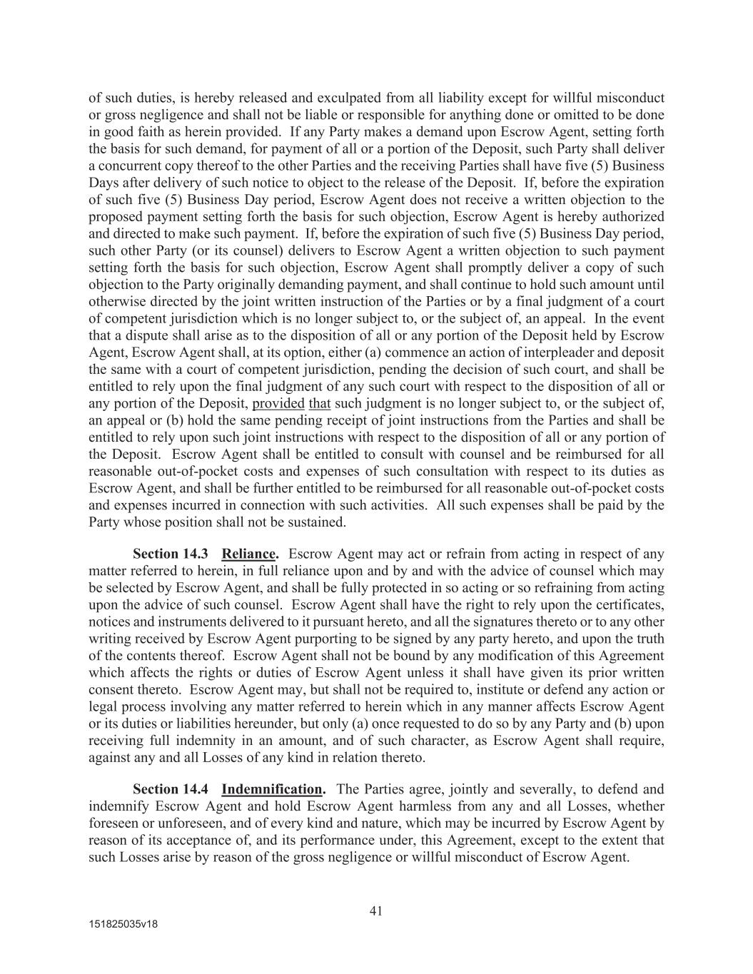 41 151825035v18 of such duties, is hereby released and exculpated from all liability except for willful misconduct or gross negligence and shall not be liable or responsible for anything done or omitted to be done in good faith as herein provided. If any Party makes a demand upon Escrow Agent, setting forth the basis for such demand, for payment of all or a portion of the Deposit, such Party shall deliver a concurrent copy thereof to the other Parties and the receiving Parties shall have five (5) Business Days after delivery of such notice to object to the release of the Deposit. If, before the expiration of such five (5) Business Day period, Escrow Agent does not receive a written objection to the proposed payment setting forth the basis for such objection, Escrow Agent is hereby authorized and directed to make such payment. If, before the expiration of such five (5) Business Day period, such other Party (or its counsel) delivers to Escrow Agent a written objection to such payment setting forth the basis for such objection, Escrow Agent shall promptly deliver a copy of such objection to the Party originally demanding payment, and shall continue to hold such amount until otherwise directed by the joint written instruction of the Parties or by a final judgment of a court of competent jurisdiction which is no longer subject to, or the subject of, an appeal. In the event that a dispute shall arise as to the disposition of all or any portion of the Deposit held by Escrow Agent, Escrow Agent shall, at its option, either (a) commence an action of interpleader and deposit the same with a court of competent jurisdiction, pending the decision of such court, and shall be entitled to rely upon the final judgment of any such court with respect to the disposition of all or any portion of the Deposit, provided that such judgment is no longer subject to, or the subject of, an appeal or (b) hold the same pending receipt of joint instructions from the Parties and shall be entitled to rely upon such joint instructions with respect to the disposition of all or any portion of the Deposit. Escrow Agent shall be entitled to consult with counsel and be reimbursed for all reasonable out-of-pocket costs and expenses of such consultation with respect to its duties as Escrow Agent, and shall be further entitled to be reimbursed for all reasonable out-of-pocket costs and expenses incurred in connection with such activities. All such expenses shall be paid by the Party whose position shall not be sustained. Section 14.3 Reliance. Escrow Agent may act or refrain from acting in respect of any matter referred to herein, in full reliance upon and by and with the advice of counsel which may be selected by Escrow Agent, and shall be fully protected in so acting or so refraining from acting upon the advice of such counsel. Escrow Agent shall have the right to rely upon the certificates, notices and instruments delivered to it pursuant hereto, and all the signatures thereto or to any other writing received by Escrow Agent purporting to be signed by any party hereto, and upon the truth of the contents thereof. Escrow Agent shall not be bound by any modification of this Agreement which affects the rights or duties of Escrow Agent unless it shall have given its prior written consent thereto. Escrow Agent may, but shall not be required to, institute or defend any action or legal process involving any matter referred to herein which in any manner affects Escrow Agent or its duties or liabilities hereunder, but only (a) once requested to do so by any Party and (b) upon receiving full indemnity in an amount, and of such character, as Escrow Agent shall require, against any and all Losses of any kind in relation thereto. Section 14.4 Indemnification. The Parties agree, jointly and severally, to defend and indemnify Escrow Agent and hold Escrow Agent harmless from any and all Losses, whether foreseen or unforeseen, and of every kind and nature, which may be incurred by Escrow Agent by reason of its acceptance of, and its performance under, this Agreement, except to the extent that such Losses arise by reason of the gross negligence or willful misconduct of Escrow Agent.