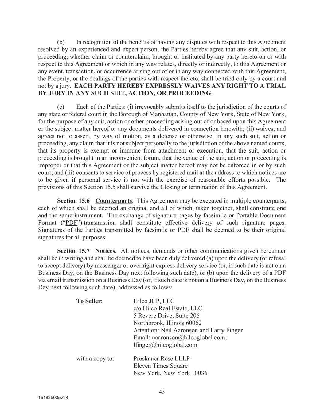 43 151825035v18 (b) In recognition of the benefits of having any disputes with respect to this Agreement resolved by an experienced and expert person, the Parties hereby agree that any suit, action, or proceeding, whether claim or counterclaim, brought or instituted by any party hereto on or with respect to this Agreement or which in any way relates, directly or indirectly, to this Agreement or any event, transaction, or occurrence arising out of or in any way connected with this Agreement, the Property, or the dealings of the parties with respect thereto, shall be tried only by a court and not by a jury. EACH PARTY HEREBY EXPRESSLY WAIVES ANY RIGHT TO A TRIAL BY JURY IN ANY SUCH SUIT, ACTION, OR PROCEEDING. (c) Each of the Parties: (i) irrevocably submits itself to the jurisdiction of the courts of any state or federal court in the Borough of Manhattan, County of New York, State of New York, for the purpose of any suit, action or other proceeding arising out of or based upon this Agreement or the subject matter hereof or any documents delivered in connection herewith; (ii) waives, and agrees not to assert, by way of motion, as a defense or otherwise, in any such suit, action or proceeding, any claim that it is not subject personally to the jurisdiction of the above named courts, that its property is exempt or immune from attachment or execution, that the suit, action or proceeding is brought in an inconvenient forum, that the venue of the suit, action or proceeding is improper or that this Agreement or the subject matter hereof may not be enforced in or by such court; and (iii) consents to service of process by registered mail at the address to which notices are to be given if personal service is not with the exercise of reasonable efforts possible. The provisions of this Section 15.5 shall survive the Closing or termination of this Agreement. Section 15.6 Counterparts. This Agreement may be executed in multiple counterparts, each of which shall be deemed an original and all of which, taken together, shall constitute one and the same instrument. The exchange of signature pages by facsimile or Portable Document Format (“PDF”) transmission shall constitute effective delivery of such signature pages. Signatures of the Parties transmitted by facsimile or PDF shall be deemed to be their original signatures for all purposes. Section 15.7 Notices. All notices, demands or other communications given hereunder shall be in writing and shall be deemed to have been duly delivered (a) upon the delivery (or refusal to accept delivery) by messenger or overnight express delivery service (or, if such date is not on a Business Day, on the Business Day next following such date), or (b) upon the delivery of a PDF via email transmission on a Business Day (or, if such date is not on a Business Day, on the Business Day next following such date), addressed as follows: To Seller: Hilco JCP, LLC c/o Hilco Real Estate, LLC 5 Revere Drive, Suite 206 Northbrook, Illinois 60062 Attention: Neil Aaronson and Larry Finger Email: naaronson@hilcoglobal.com; lfinger@hilcoglobal.com with a copy to: Proskauer Rose LLLP Eleven Times Square New York, New York 10036