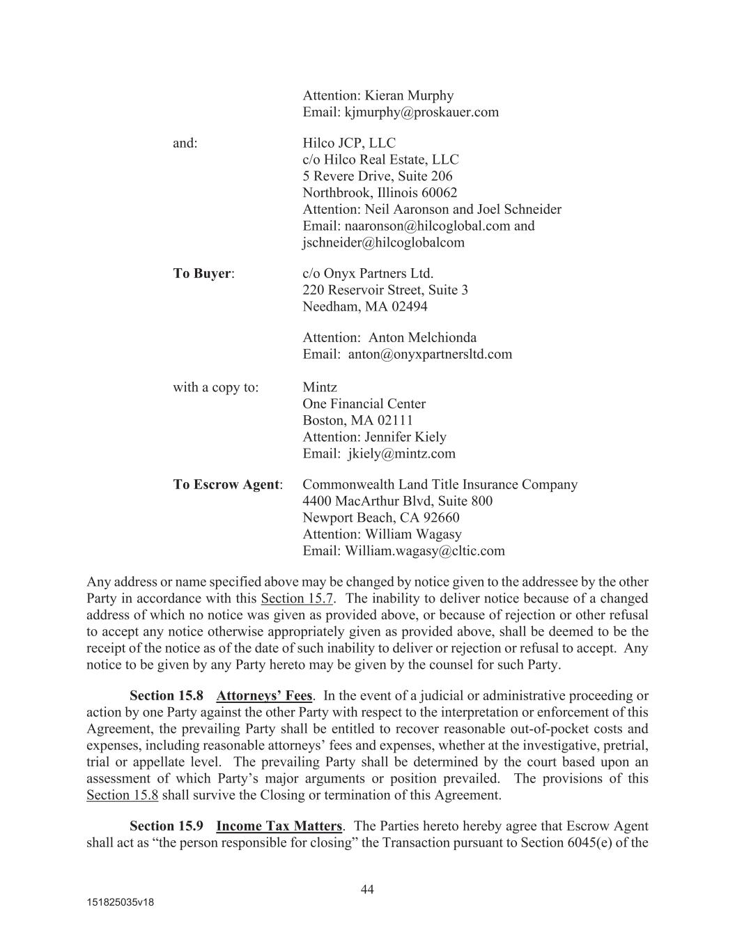 44 151825035v18 Attention: Kieran Murphy Email: kjmurphy@proskauer.com and: Hilco JCP, LLC c/o Hilco Real Estate, LLC 5 Revere Drive, Suite 206 Northbrook, Illinois 60062 Attention: Neil Aaronson and Joel Schneider Email: naaronson@hilcoglobal.com and jschneider@hilcoglobalcom To Buyer: c/o Onyx Partners Ltd. 220 Reservoir Street, Suite 3 Needham, MA 02494 Attention: Anton Melchionda Email: anton@onyxpartnersltd.com with a copy to: Mintz One Financial Center Boston, MA 02111 Attention: Jennifer Kiely Email: jkiely@mintz.com To Escrow Agent: Commonwealth Land Title Insurance Company 4400 MacArthur Blvd, Suite 800 Newport Beach, CA 92660 Attention: William Wagasy Email: William.wagasy@cltic.com Any address or name specified above may be changed by notice given to the addressee by the other Party in accordance with this Section 15.7. The inability to deliver notice because of a changed address of which no notice was given as provided above, or because of rejection or other refusal to accept any notice otherwise appropriately given as provided above, shall be deemed to be the receipt of the notice as of the date of such inability to deliver or rejection or refusal to accept. Any notice to be given by any Party hereto may be given by the counsel for such Party. Section 15.8 Attorneys’ Fees. In the event of a judicial or administrative proceeding or action by one Party against the other Party with respect to the interpretation or enforcement of this Agreement, the prevailing Party shall be entitled to recover reasonable out-of-pocket costs and expenses, including reasonable attorneys’ fees and expenses, whether at the investigative, pretrial, trial or appellate level. The prevailing Party shall be determined by the court based upon an assessment of which Party’s major arguments or position prevailed. The provisions of this Section 15.8 shall survive the Closing or termination of this Agreement. Section 15.9 Income Tax Matters. The Parties hereto hereby agree that Escrow Agent shall act as “the person responsible for closing” the Transaction pursuant to Section 6045(e) of the