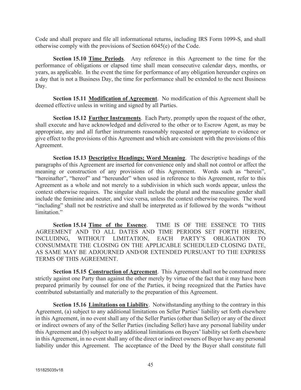 45 151825035v18 Code and shall prepare and file all informational returns, including IRS Form 1099-S, and shall otherwise comply with the provisions of Section 6045(e) of the Code. Section 15.10 Time Periods. Any reference in this Agreement to the time for the performance of obligations or elapsed time shall mean consecutive calendar days, months, or years, as applicable. In the event the time for performance of any obligation hereunder expires on a day that is not a Business Day, the time for performance shall be extended to the next Business Day. Section 15.11 Modification of Agreement. No modification of this Agreement shall be deemed effective unless in writing and signed by all Parties. Section 15.12 Further Instruments. Each Party, promptly upon the request of the other, shall execute and have acknowledged and delivered to the other or to Escrow Agent, as may be appropriate, any and all further instruments reasonably requested or appropriate to evidence or give effect to the provisions of this Agreement and which are consistent with the provisions of this Agreement. Section 15.13 Descriptive Headings; Word Meaning. The descriptive headings of the paragraphs of this Agreement are inserted for convenience only and shall not control or affect the meaning or construction of any provisions of this Agreement. Words such as “herein”, “hereinafter”, “hereof” and “hereunder” when used in reference to this Agreement, refer to this Agreement as a whole and not merely to a subdivision in which such words appear, unless the context otherwise requires. The singular shall include the plural and the masculine gender shall include the feminine and neuter, and vice versa, unless the context otherwise requires. The word “including” shall not be restrictive and shall be interpreted as if followed by the words “without limitation.” Section 15.14 Time of the Essence. TIME IS OF THE ESSENCE TO THIS AGREEMENT AND TO ALL DATES AND TIME PERIODS SET FORTH HEREIN, INCLUDING, WITHOUT LIMITATION, EACH PARTY’S OBLIGATION TO CONSUMMATE THE CLOSING ON THE APPLICABLE SCHEDULED CLOSING DATE, AS SAME MAY BE ADJOURNED AND/OR EXTENDED PURSUANT TO THE EXPRESS TERMS OF THIS AGREEMENT. Section 15.15 Construction of Agreement. This Agreement shall not be construed more strictly against one Party than against the other merely by virtue of the fact that it may have been prepared primarily by counsel for one of the Parties, it being recognized that the Parties have contributed substantially and materially to the preparation of this Agreement. Section 15.16 Limitations on Liability. Notwithstanding anything to the contrary in this Agreement, (a) subject to any additional limitations on Seller Parties’ liability set forth elsewhere in this Agreement, in no event shall any of the Seller Parties (other than Seller) or any of the direct or indirect owners of any of the Seller Parties (including Seller) have any personal liability under this Agreement and (b) subject to any additional limitations on Buyers’ liability set forth elsewhere in this Agreement, in no event shall any of the direct or indirect owners of Buyer have any personal liability under this Agreement. The acceptance of the Deed by the Buyer shall constitute full