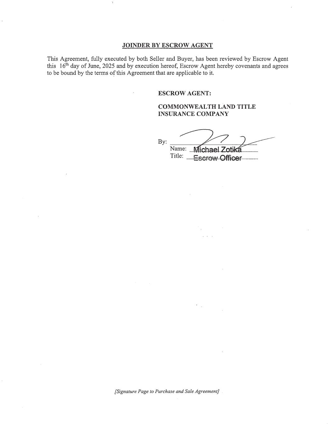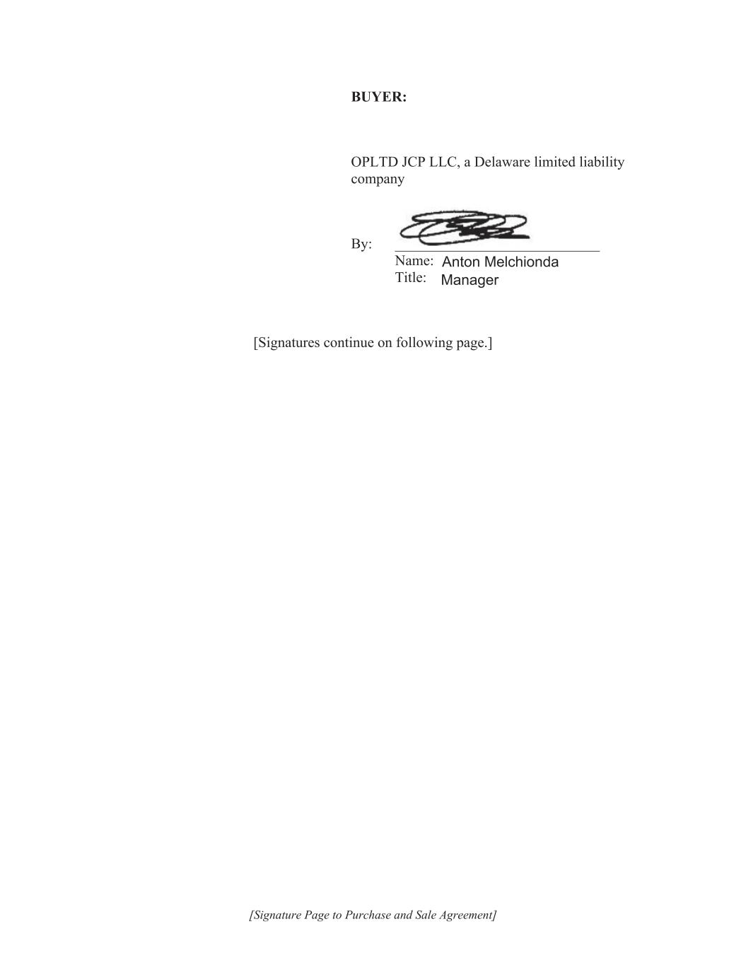 [Signature Page to Purchase and Sale Agreement] BUYER: OPLTD JCP LLC, a Delaware limited liability company By: ____________________________ Name: Title: [Signatures continue on following page.] Anton Melchionda Manager