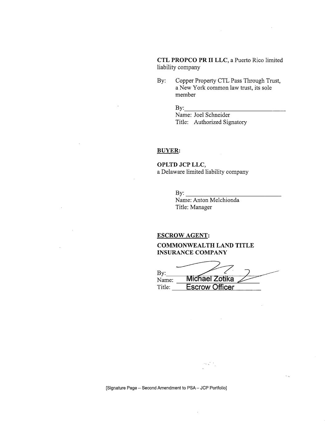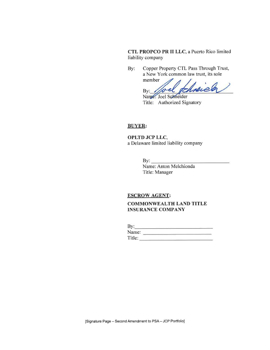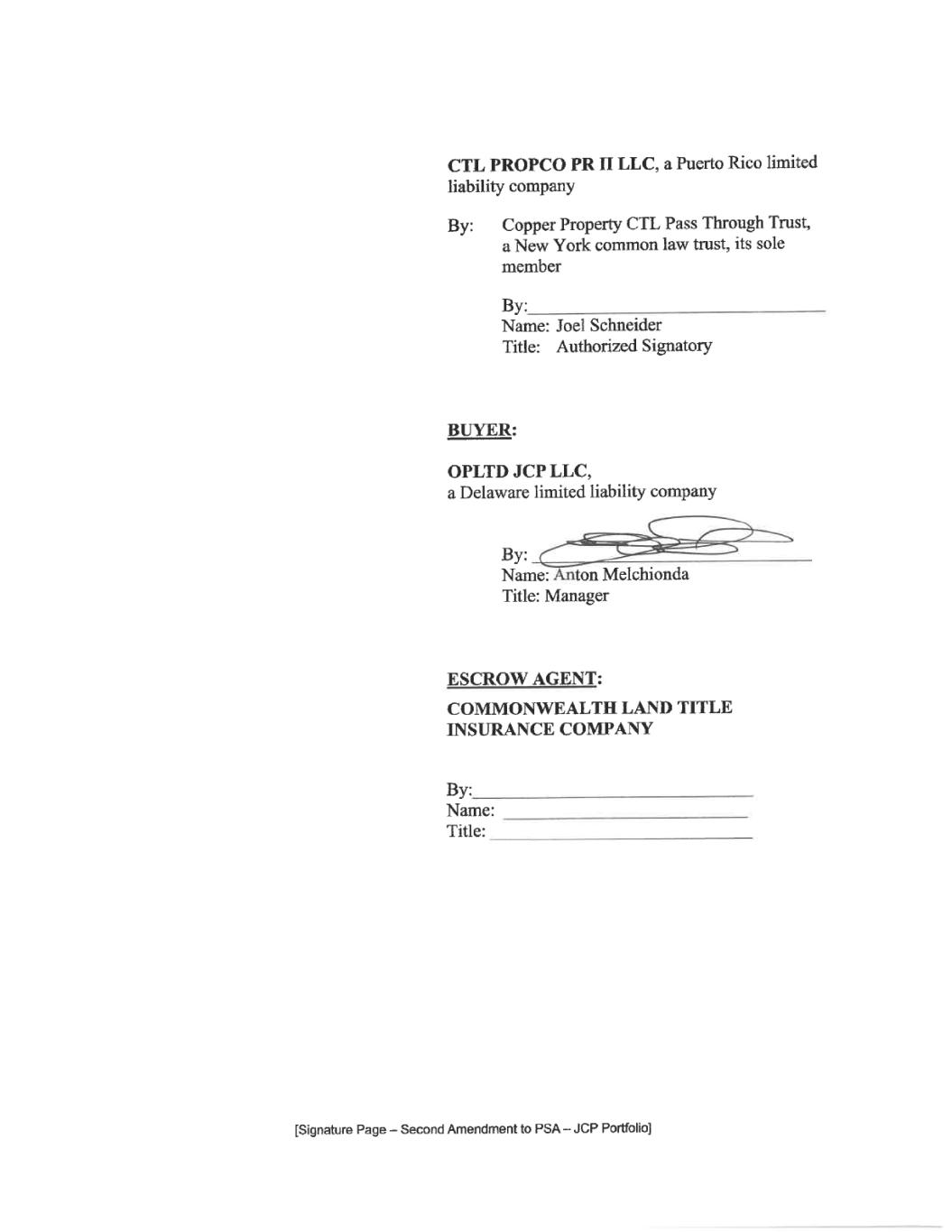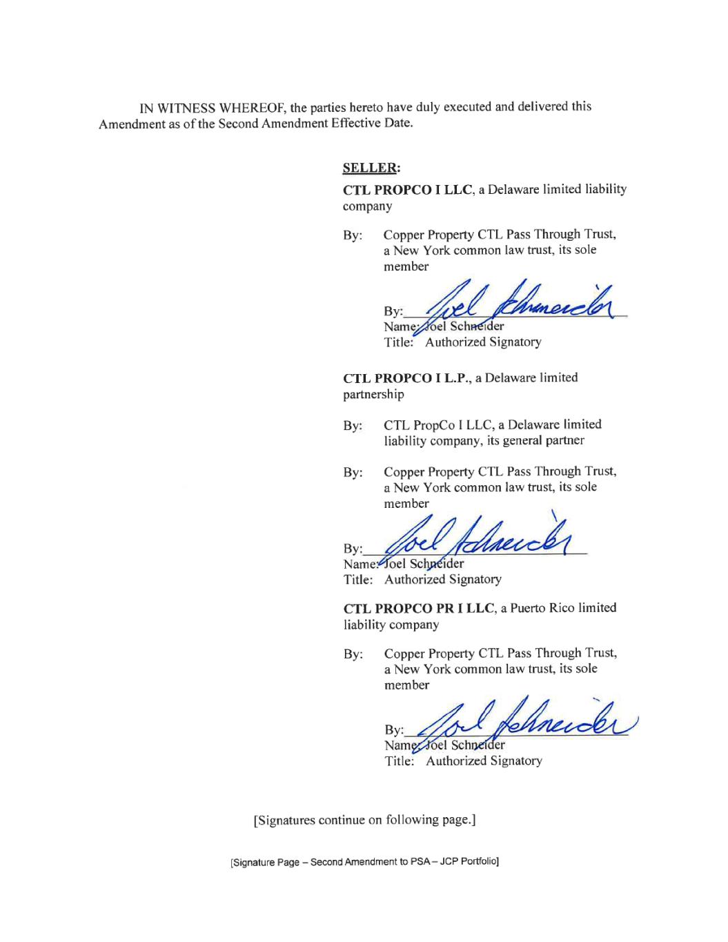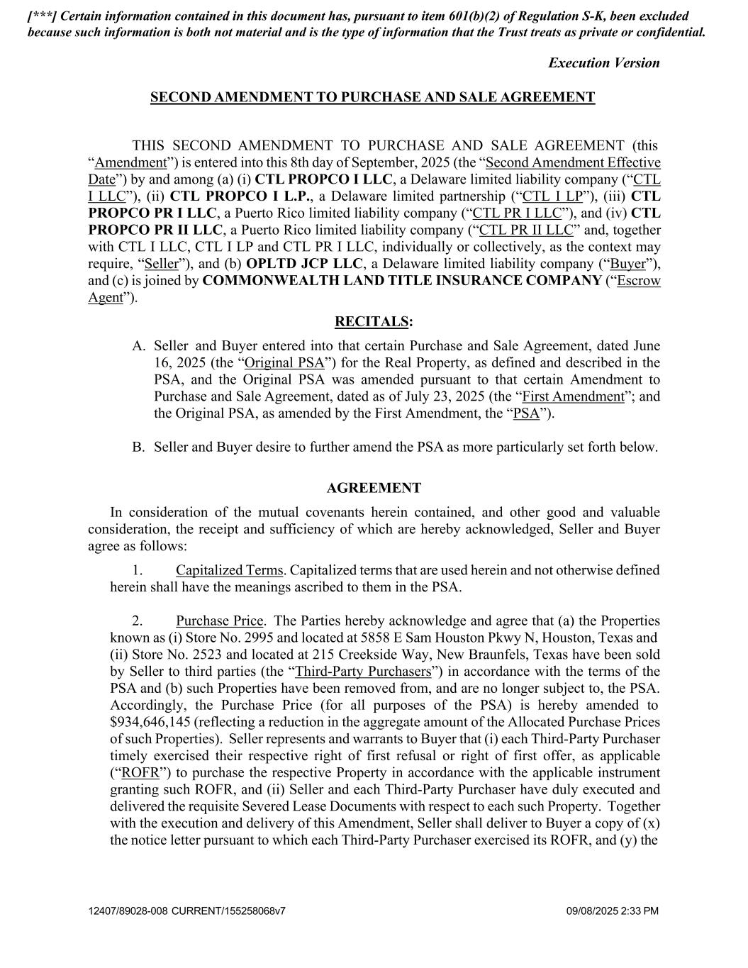 12407/89028-008 CURRENT/155258068v7 09/08/2025 2:33 PM Execution Version SECOND AMENDMENT TO PURCHASE AND SALE AGREEMENT THIS SECOND AMENDMENT TO PURCHASE AND SALE AGREEMENT (this “Amendment”) is entered into this 8th day of September, 2025 (the “Second Amendment Effective Date”) by and among (a) (i) CTL PROPCO I LLC, a Delaware limited liability company (“CTL I LLC”), (ii) CTL PROPCO I L.P., a Delaware limited partnership (“CTL I LP”), (iii) CTL PROPCO PR I LLC, a Puerto Rico limited liability company (“CTL PR I LLC”), and (iv) CTL PROPCO PR II LLC, a Puerto Rico limited liability company (“CTL PR II LLC” and, together with CTL I LLC, CTL I LP and CTL PR I LLC, individually or collectively, as the context may require, “Seller”), and (b) OPLTD JCP LLC, a Delaware limited liability company (“Buyer”), and (c) is joined by COMMONWEALTH LAND TITLE INSURANCE COMPANY (“Escrow Agent”). RECITALS: A. Seller and Buyer entered into that certain Purchase and Sale Agreement, dated June 16, 2025 (the “Original PSA”) for the Real Property, as defined and described in the PSA, and the Original PSA was amended pursuant to that certain Amendment to Purchase and Sale Agreement, dated as of July 23, 2025 (the “First Amendment”; and the Original PSA, as amended by the First Amendment, the “PSA”). B. Seller and Buyer desire to further amend the PSA as more particularly set forth below. AGREEMENT In consideration of the mutual covenants herein contained, and other good and valuable consideration, the receipt and sufficiency of which are hereby acknowledged, Seller and Buyer agree as follows: 1. Capitalized Terms. Capitalized terms that are used herein and not otherwise defined herein shall have the meanings ascribed to them in the PSA. 2. Purchase Price. The Parties hereby acknowledge and agree that (a) the Properties known as (i) Store No. 2995 and located at 5858 E Sam Houston Pkwy N, Houston, Texas and (ii) Store No. 2523 and located at 215 Creekside Way, New Braunfels, Texas have been sold by Seller to third parties (the “Third-Party Purchasers”) in accordance with the terms of the PSA and (b) such Properties have been removed from, and are no longer subject to, the PSA. Accordingly, the Purchase Price (for all purposes of the PSA) is hereby amended to $934,646,145 (reflecting a reduction in the aggregate amount of the Allocated Purchase Prices of such Properties). Seller represents and warrants to Buyer that (i) each Third-Party Purchaser timely exercised their respective right of first refusal or right of first offer, as applicable (“ROFR”) to purchase the respective Property in accordance with the applicable instrument granting such ROFR, and (ii) Seller and each Third-Party Purchaser have duly executed and delivered the requisite Severed Lease Documents with respect to each such Property. Together with the execution and delivery of this Amendment, Seller shall deliver to Buyer a copy of (x) the notice letter pursuant to which each Third-Party Purchaser exercised its ROFR, and (y) the [***] Certain information contained in this document has, pursuant to item 601(b)(2) of Regulation S-K, been excluded because such information is both not material and is the type of information that the Trust treats as private or confidential.