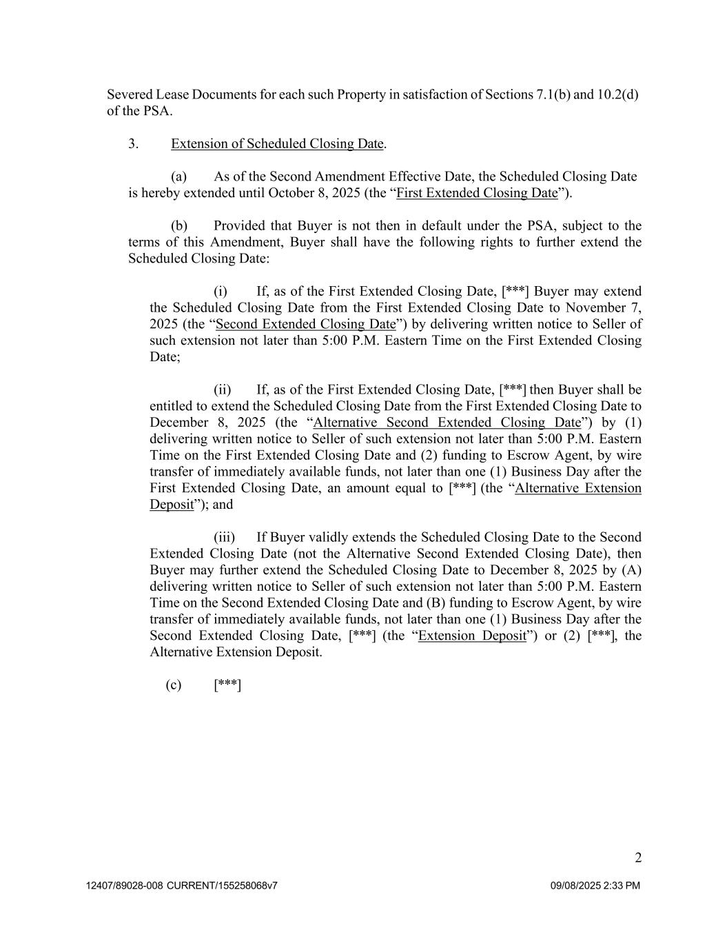 12407/89028-008 CURRENT/155258068v7 09/08/2025 2:33 PM Severed Lease Documents for each such Property in satisfaction of Sections 7.1(b) and 10.2(d) of the PSA. 3. Extension of Scheduled Closing Date. (a) As of the Second Amendment Effective Date, the Scheduled Closing Date is hereby extended until October 8, 2025 (the “First Extended Closing Date”). (b) Provided that Buyer is not then in default under the PSA, subject to the terms of this Amendment, Buyer shall have the following rights to further extend the Scheduled Closing Date: (i) If, as of the First Extended Closing Date, [***] Buyer may extend the Scheduled Closing Date from the First Extended Closing Date to November 7, 2025 (the “Second Extended Closing Date”) by delivering written notice to Seller of such extension not later than 5:00 P.M. Eastern Time on the First Extended Closing Date; (ii) If, as of the First Extended Closing Date, [***] then Buyer shall be entitled to extend the Scheduled Closing Date from the First Extended Closing Date to December 8, 2025 (the “Alternative Second Extended Closing Date”) by (1) delivering written notice to Seller of such extension not later than 5:00 P.M. Eastern Time on the First Extended Closing Date and (2) funding to Escrow Agent, by wire transfer of immediately available funds, not later than one (1) Business Day after the First Extended Closing Date, an amount equal to [***] (the “Alternative Extension Deposit”); and (iii) If Buyer validly extends the Scheduled Closing Date to the Second Extended Closing Date (not the Alternative Second Extended Closing Date), then Buyer may further extend the Scheduled Closing Date to December 8, 2025 by (A) delivering written notice to Seller of such extension not later than 5:00 P.M. Eastern Time on the Second Extended Closing Date and (B) funding to Escrow Agent, by wire transfer of immediately available funds, not later than one (1) Business Day after the Second Extended Closing Date, [***] (the “Extension Deposit”) or (2) [***], the Alternative Extension Deposit. (c) [***] 2
