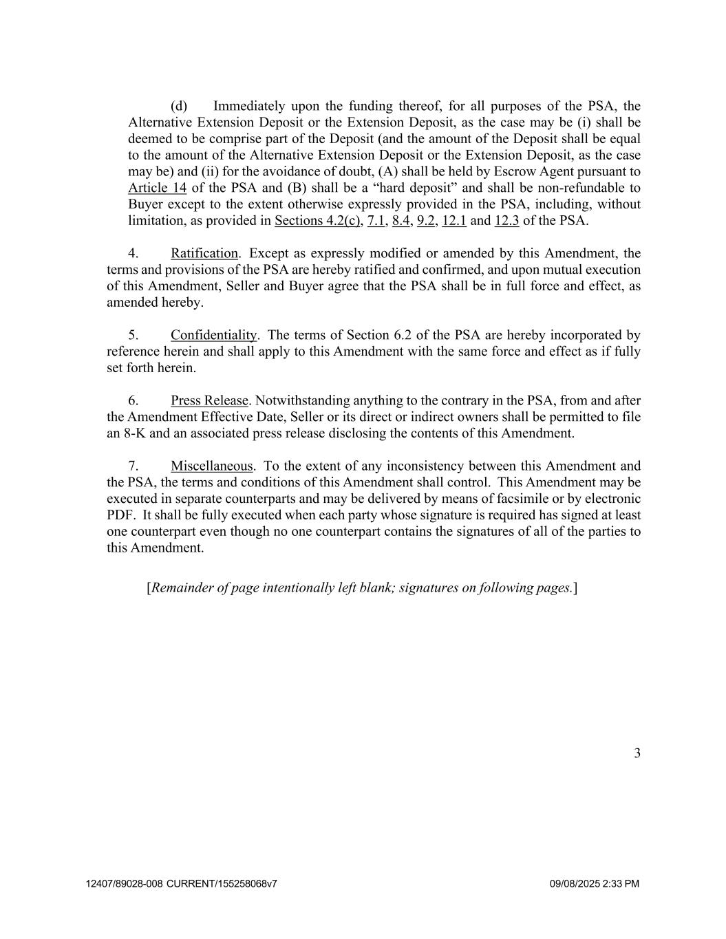 12407/89028-008 CURRENT/155258068v7 09/08/2025 2:33 PM (d) Immediately upon the funding thereof, for all purposes of the PSA, the Alternative Extension Deposit or the Extension Deposit, as the case may be (i) shall be deemed to be comprise part of the Deposit (and the amount of the Deposit shall be equal to the amount of the Alternative Extension Deposit or the Extension Deposit, as the case may be) and (ii) for the avoidance of doubt, (A) shall be held by Escrow Agent pursuant to Article 14 of the PSA and (B) shall be a “hard deposit” and shall be non-refundable to Buyer except to the extent otherwise expressly provided in the PSA, including, without limitation, as provided in Sections 4.2(c), 7.1, 8.4, 9.2, 12.1 and 12.3 of the PSA. 4. Ratification. Except as expressly modified or amended by this Amendment, the terms and provisions of the PSA are hereby ratified and confirmed, and upon mutual execution of this Amendment, Seller and Buyer agree that the PSA shall be in full force and effect, as amended hereby. 5. Confidentiality. The terms of Section 6.2 of the PSA are hereby incorporated by reference herein and shall apply to this Amendment with the same force and effect as if fully set forth herein. 6. Press Release. Notwithstanding anything to the contrary in the PSA, from and after the Amendment Effective Date, Seller or its direct or indirect owners shall be permitted to file an 8-K and an associated press release disclosing the contents of this Amendment. 7. Miscellaneous. To the extent of any inconsistency between this Amendment and the PSA, the terms and conditions of this Amendment shall control. This Amendment may be executed in separate counterparts and may be delivered by means of facsimile or by electronic PDF. It shall be fully executed when each party whose signature is required has signed at least one counterpart even though no one counterpart contains the signatures of all of the parties to this Amendment. [Remainder of page intentionally left blank; signatures on following pages.] 3