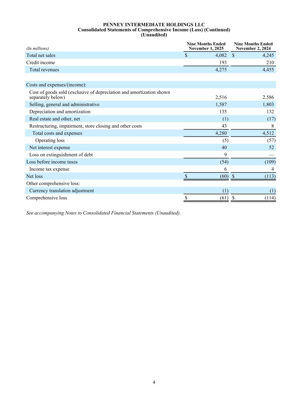 PENNEY INTERMEDIATE HOLDINGS LLC Consolidated Statements of Comprehensive Income (Loss) (Unaudited) (In millions) Three Months Ended November 1, 2025 Three Months Ended November 2, 2024 Total net sales $ 1,356 $ 1,410 Credit income 66 93 Total revenues 1,422 1,503 Costs and expenses/(income): Cost of goods sold (exclusive of depreciation and amortization shown separately below) 841 865 Selling, general and administrative 588 601 Depreciation and amortization 46 47 Real estate and other, net — (17) Restructuring, impairment, store closing and other costs 26 5 Total costs and expenses 1,501 1,501 Operating income (loss) (79) 2 Net interest expense 9 17 Loss on extinguishment of debt 9 — Loss before income taxes (97) (15) Income tax expense 3 2 Net loss $ (100) $ (17) Other comprehensive income (loss): Currency translation adjustment — — Comprehensive loss $ (100) $ (17) See accompanying Notes to Consolidated Financial Statements (Unaudited). 3