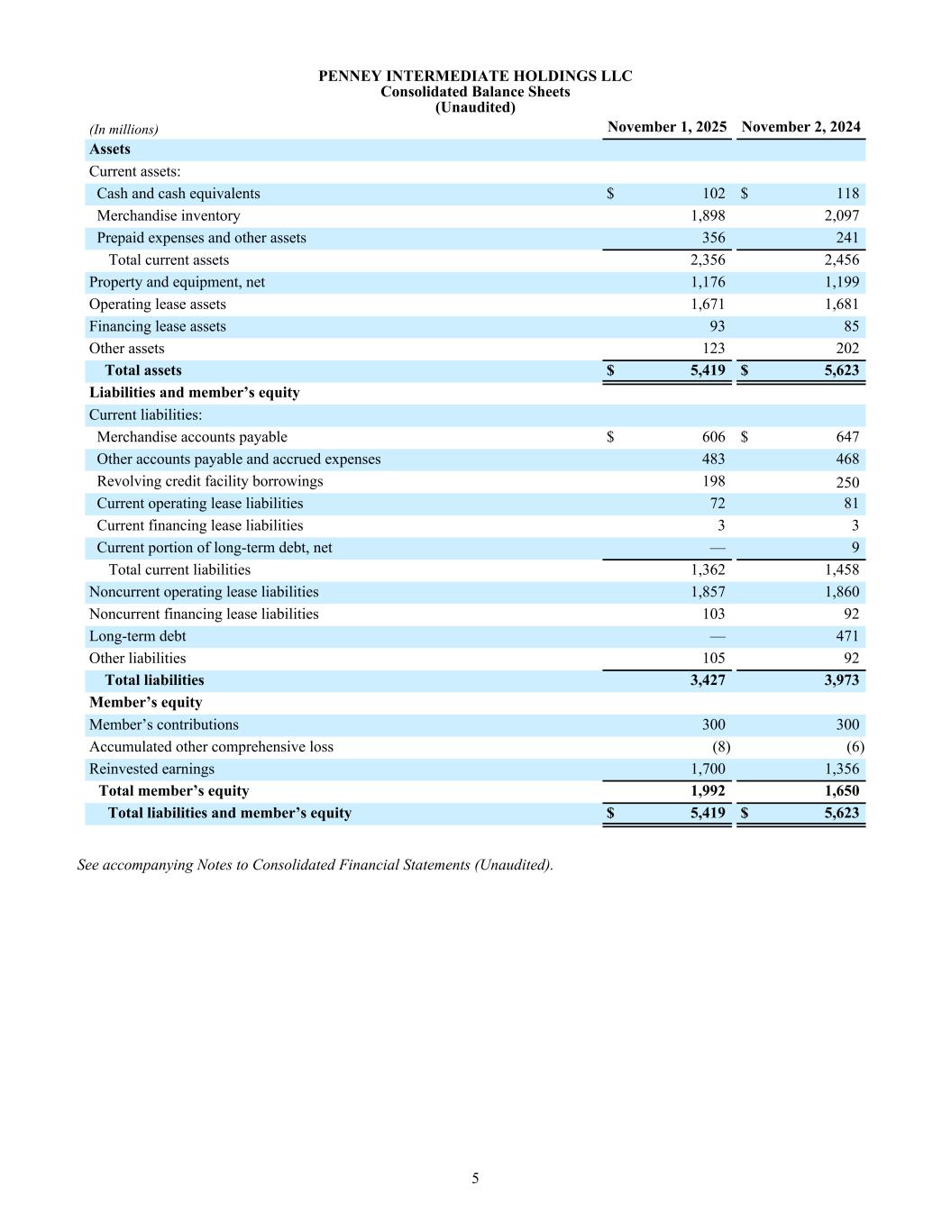 PENNEY INTERMEDIATE HOLDINGS LLC Consolidated Balance Sheets (Unaudited) (In millions) November 1, 2025 November 2, 2024 Assets Current assets: Cash and cash equivalents $ 102 $ 118 Merchandise inventory 1,898 2,097 Prepaid expenses and other assets 356 241 Total current assets 2,356 2,456 Property and equipment, net 1,176 1,199 Operating lease assets 1,671 1,681 Financing lease assets 93 85 Other assets 123 202 Total assets $ 5,419 $ 5,623 Liabilities and member’s equity Current liabilities: Merchandise accounts payable $ 606 $ 647 Other accounts payable and accrued expenses 483 468 Revolving credit facility borrowings 198 250 Current operating lease liabilities 72 81 Current financing lease liabilities 3 3 Current portion of long-term debt, net — 9 Total current liabilities 1,362 1,458 Noncurrent operating lease liabilities 1,857 1,860 Noncurrent financing lease liabilities 103 92 Long-term debt — 471 Other liabilities 105 92 Total liabilities 3,427 3,973 Member’s equity Member’s contributions 300 300 Accumulated other comprehensive loss (8) (6) Reinvested earnings 1,700 1,356 Total member’s equity 1,992 1,650 Total liabilities and member’s equity $ 5,419 $ 5,623 See accompanying Notes to Consolidated Financial Statements (Unaudited). 5