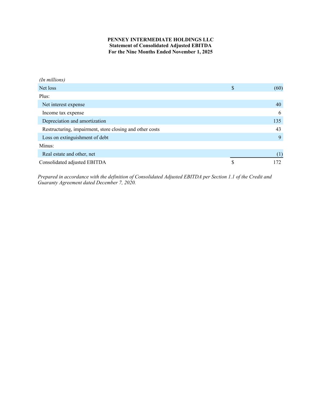 PENNEY INTERMEDIATE HOLDINGS LLC Statement of Consolidated Adjusted EBITDA For the Nine Months Ended November 1, 2025 (In millions) Net loss $ (60) Plus: Net interest expense 40 Income tax expense 6 Depreciation and amortization 135 Restructuring, impairment, store closing and other costs 43 Loss on extinguishment of debt 9 Minus: Real estate and other, net (1) Consolidated adjusted EBITDA $ 172 Prepared in accordance with the definition of Consolidated Adjusted EBITDA per Section 1.1 of the Credit and Guaranty Agreement dated December 7, 2020.