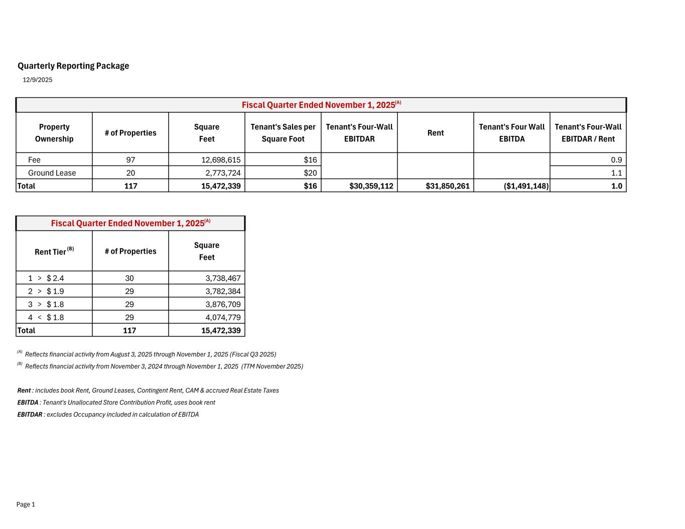 Quarterly Reporting Package 12/9/2025 Property Ownership # of Properties Square Feet Tenant's Sales per Square Foot Tenant's Four-Wall EBITDAR Rent Tenant's Four Wall EBITDA Tenant's Four-Wall EBITDAR / Rent Fee 97 12,698,615 $16 $22,441,232 $24,828,557 ($2,387,325) 0.9 Ground Lease 20 2,773,724 $20 $7,917,880 $7,021,704 $896,176 1.1 Total 117 15,472,339 $16 $30,359,112 $31,850,261 ($1,491,148) 1.0 Rent Tier (B) # of Properties Square Feet 1 > $ 2.4 30 3,738,467 2 > $ 1.9 29 3,782,384 3 > $ 1.8 29 3,876,709 4 < $ 1.8 29 4,074,779 Total 117 15,472,339 (A) Reflects financial activity from August 3, 2025 through November 1, 2025 (Fiscal Q3 2025) (B) Reflects financial activity from November 3, 2024 through November 1, 2025 (TTM November 2025) Rent : includes book Rent, Ground Leases, Contingent Rent, CAM & accrued Real Estate Taxes EBITDA : Tenant's Unallocated Store Contribution Profit, uses book rent EBITDAR : excludes Occupancy included in calculation of EBITDA Fiscal Quarter Ended November 1, 2025(A) Fiscal Quarter Ended November 1, 2025(A) Page 1